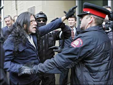 He did not get far, as could be expected. Nonetheless, the 60 year old man, (a veteran native Mohawk activist and actor, aka John Boncore) was thrown to the ground, handcuffed, and taken to jail, where he was he was beaten and charged with "assault" and "obstruction". This is a further insult to Canadians and the concept of "justice", in light of the crimes of Canada (aiding and abetting) for having allowed Bush to enter and to speak here. Rather than releasing him on his own recognizance, Splitting the Sky spent the night in jail, where he was beaten, before being taken before a JP in the morning, and released on $500 bail, paid for by local activists.