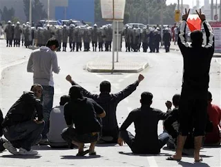The demonstration at the hospital had already drawn thousands of Shia protesters ~ including hundreds of doctors and nurses from all over Manama, still in their white gowns ~ to demand the resignation of the Bahraini Minister of Health, Faisal Mohamed al-Homor, for refusing to allow ambulances to fetch the dead and injured from Thursday morning's police attack on the Pearl Square demonstrators.