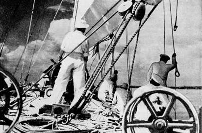 At sea with hemp sails and rope.