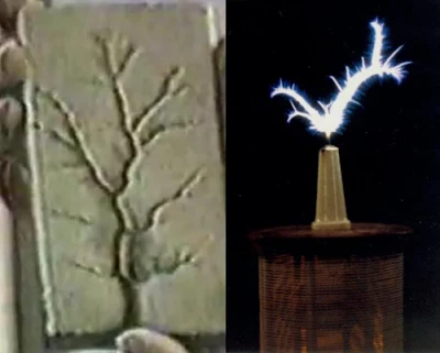 The shape on the left has been burned into wood by a Tesla coil. The right is the special kind of electricity Tesla discovered in its pure raw form. Notice the organic shape.
