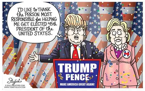 International cartoonists are being absolutely horrible to Donald Trump. Remember how the world was encouraged to greet Obama with open arms and he was greeted as a pop star? Well, The Donald is being treated as the anti Christ almost. Every innuendo is upheld by artists around the world, a sure result of the media being owned by the same group who detests his success here. The above was, of course, intended to highlight that Russia is celebrating a win for Trump with a vested interest. My comment to the artist was that he missed the point and that the reason the Russians were celebrating was because they were fully aware that ~ simply by being elected ~ Trump pushed back chances for WW3 in the next few months.