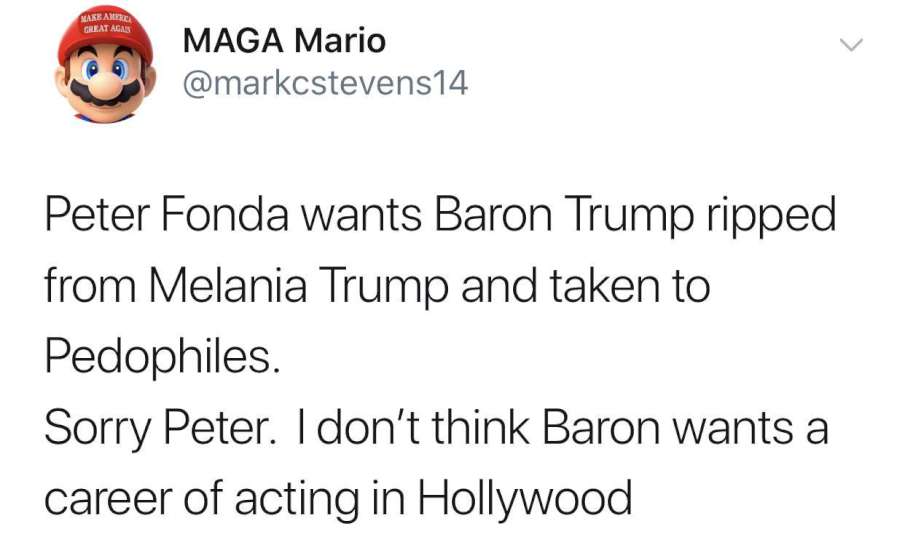 Stilton says: Alleged actor Peter Fonda took to Twitter recently to voice his hatred for the First Family, and to encourage kidnapping and pederasty as useful tools for the Left to demonstrate their moral superiority to the Deplorables in our nation.
