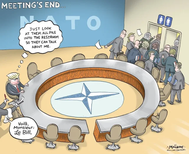 It is shocking how many cartoons I found depicting Trump's actions and words with NATO to be at the obeisance of Mr. Putin! As if the two were in cahoots on some obscure level.