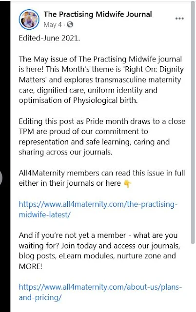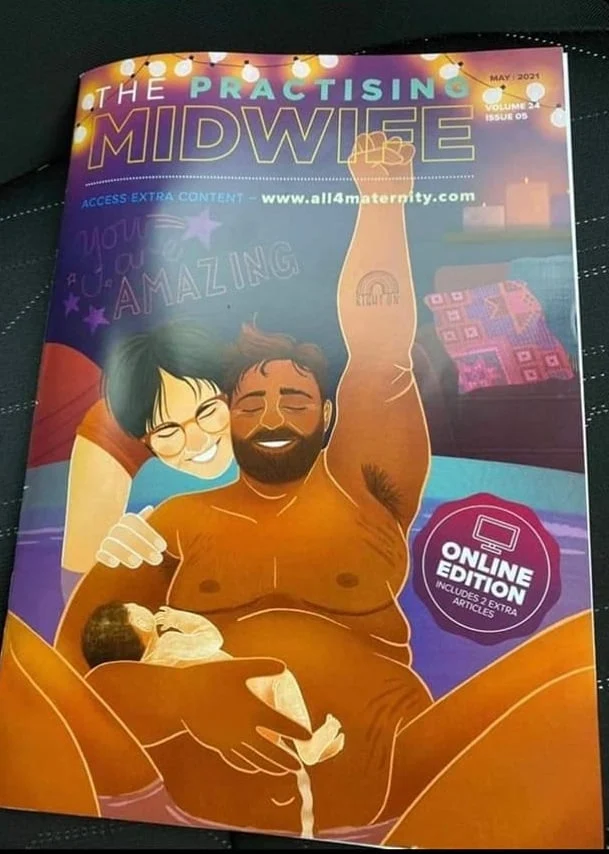 This midwifery publication is beyond the pale. At first I thought this image was, well I was not sure. Then I find it is a magazine cover. Definitely agenda driven and there will be more images to come. This issue was concerned with "dignified trans-masculine maternity care".