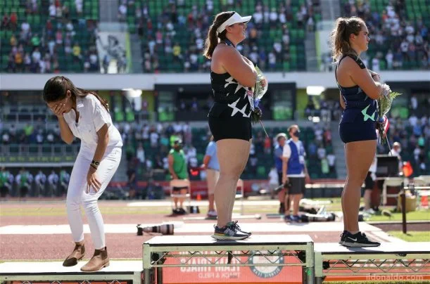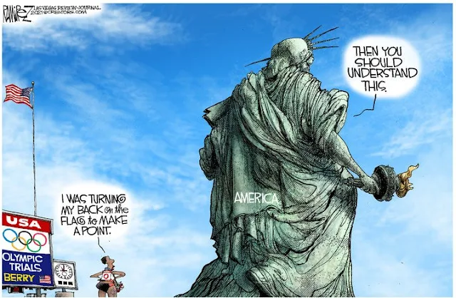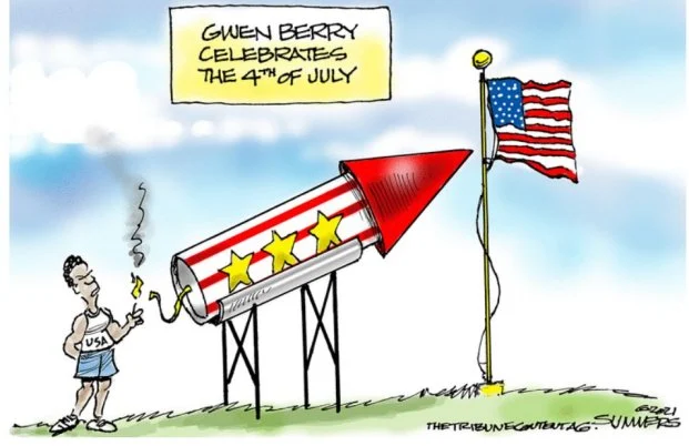 A U.S. Olympic athlete (in the highly-regarded sport of "hammer throwing") turns her well-toned ebony back on the American flag at an event because it doesn't speak for her? CLANG!