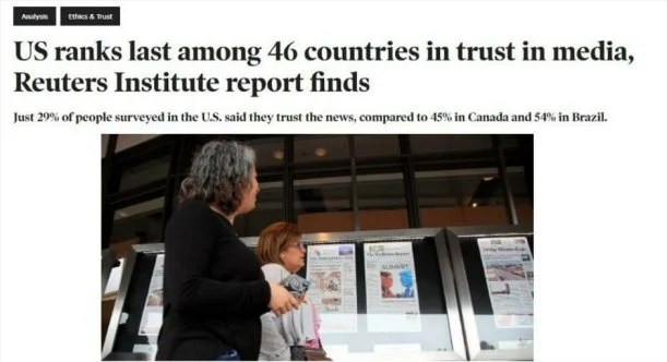 Small print: Just 29% of people surveyed in the US said they trust the news, compared to 45% in Canada and 54% in Brazil. That is a huge percentage in Canada and explains the submissiveness of the people.