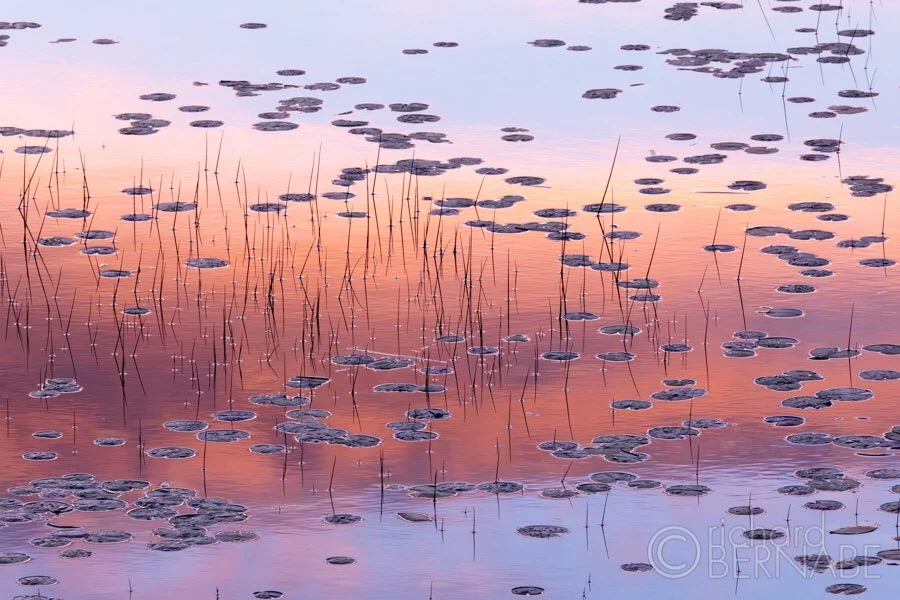Sunset reflected in a beaver pond.