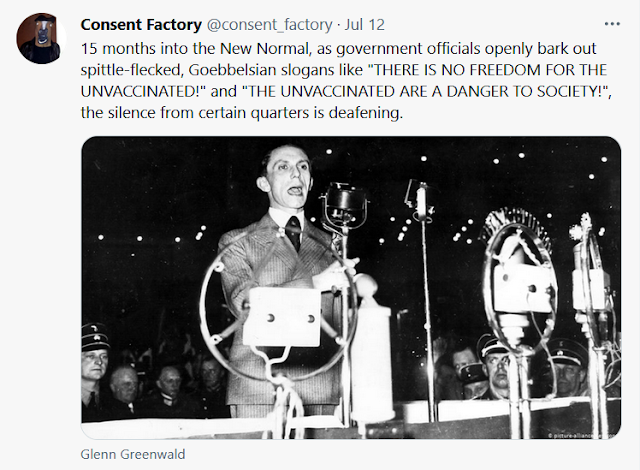15 months into the New Normal, as government officials openly bark out spittle-flecked, Goebbelsian slogans like "THERE IS NO FREEDOM FOR THE UNVACCINATED!" and "THE UNVACCINATED ARE A DANGER TO SOCIETY!", the silence from certain quarters is deafening. pic.twitter.com/bNuZ5np1Ny ~ Consent Factory (@consent_factory) July 12, 2021
