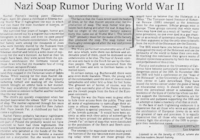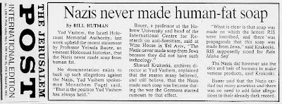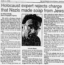 - Bill Hutman, "Nazis never made human-fat soap," The Jerusalem Post - International Edition, week ending May 5, 1990; "Holocaust Expert Rejects Charge That Nazis Made Soap From Jews," Northern California Jewish Bulletin, April 27, 1990. (JTA dispatch from Tel Aviv.) Facsimile in: Christian News, May 21, 1990, p. 19; "A Holocaust Belief Cleared Up," Chicago Tribune, April 25, 1990. Facsimile in: Ganpac Brief, June 1990, p. 8.