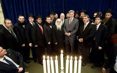 Harper surrounded by the Chabad Lubavitch who love photo ops with every politician on Earth. This does not bode well for the common folk at all.