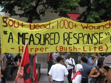 After Israel's heavy handed vicious attack on Lebanon, Harper's comment to the world was that Israel had taken a "measured response" to Hezbollah who hid among civilians. (He must have attended the school of Tzipi Livni, Israeli war criminal)TREATING HIS MINORITY GOVERNMENT STATUS