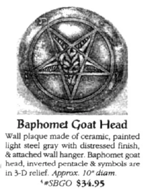 In other words, black magic. Above, the pentagram at far right is simply the same as the star at center turned upside down. In each star, evil is found in the form of the goat-headed God of darkness, Baphomet. However, in the star in the center, the Baphomet goat has what appears to be his beard pointed downward, and in the star at right (reversed image), the supposed beard becomes the torch of fire emanating from the top of the beast's head.