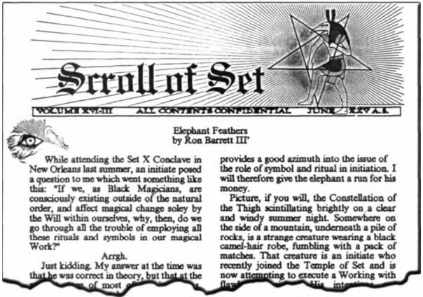 The masthead of the periodic "Scroll of Set" newsletter, published by Dr. (Colonel) Michael Aquino, High Priest of the Temple of Set.