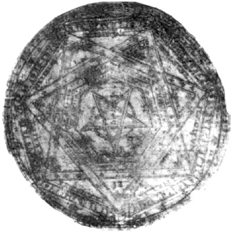 A wax talisman created by occultist Edward Kelley, using directions obtained in the angelic language he called "Enochian" (Enigma magazine, Issue 6).