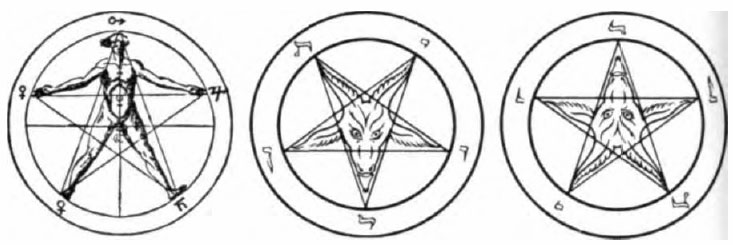 The pentagram is an ancient and modern magical, occult symbol of prime importance to Illuminists, satanists, and members of secret societies. In its upright form (left), the five-pointed star is said to be an indicator of white magic. In its inverted form (center) the same star becomes the sign of consummate evil and hellish intentions.