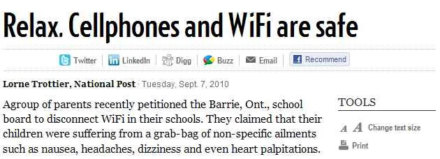 ED Noor: Here are a few quotes from previous postings on this extremely important health issue. People hate it when I tell them why I refuse to own a cell phone! Sadly they cannot disagree with a word I say. There are too many reasons to list not the least of which is the breakdown of communication between people but in this case we learn of the health risks that have resulted in some countries having WiFi pulled out of the classroom altogether.
