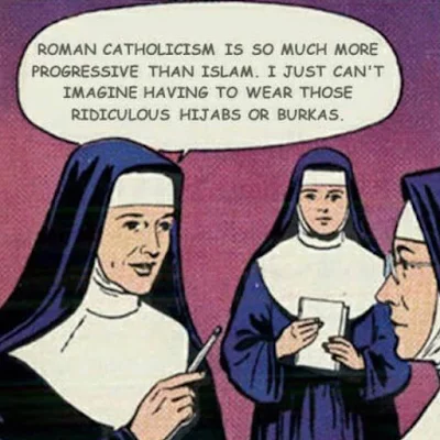 I say that, employed as it is here, this “cartoon” is morphed into more Islamophobic crap. Rather than use the head covering of nuns as a matter of DIFFERENCE between females of both Abrahamic religions; we should remember that in BOTH religions the head covering represents purity and dedication to God/Allah. This, in both cases, is in stark opposition to the push to nudity from the ruling Talmudic elite.
