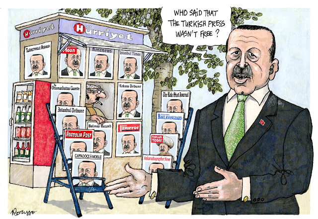 This is, I suppose, amusing. But then consider the magazine stalls in France prior to the election of little Macron. Every magazine had an image of him to appeal to some sector of the populace. But then, in France, they don't jail cartoonists.