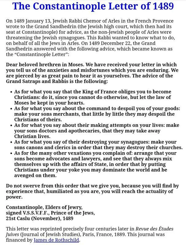 5. As for the many other vexations you complain of: arrange that your sons become advocates and lawyers, and see that they always mix in affairs of State, that by putting Christians under your yoke you may dominate the world and be avenged on them.