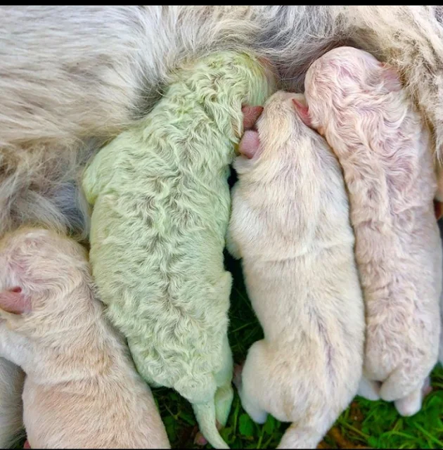 A Sardinian litter of pups. No one knows what caused the one to be green.