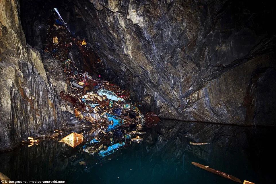 The Cave of Dead Cars in Wales. Hundreds of cars hundreds of feet beneath the ground.