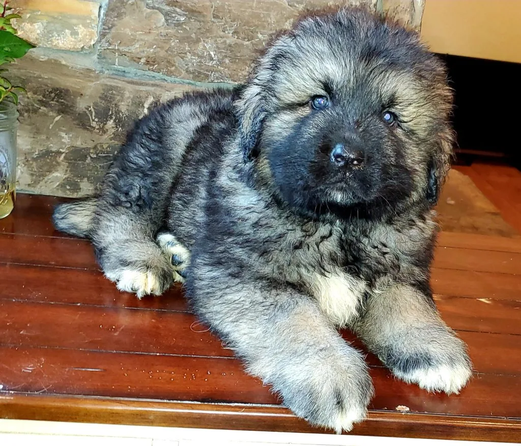 This Russian Bear Dog puppy will grow up to about 200 pounds. They are gentle giants but can be very fearsome when protecting family or flock.