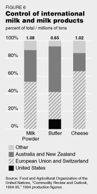 In 1994, the cartel's domination of dairy and dairy products was astonishing. Figure 6 shows that the cartel's food export regions controlled 89% of the world's export of whole milk powder, of 1.08 billion metric tons; 94% of the world's export trade of 653 million metric tons of butter; and 86% of the world's export trade of 1.11 billion metric tons of cheese. It also controlled a huge portion of the export of condensed milk.