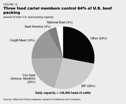 Four of the cartel's biggest companies in beef export are Cargill, Archer Daniels Midland/Töpfer, ConAgra/Peavey, and Iowa Beef Processors, now called IBP. The Dakota City, Nebraska-based IBP exemplifies how the oligarchy employs its corporate offshoots.