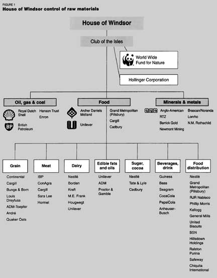 These are the key components of the Anglo-Dutch-Swiss food cartel, which is grouped around Britain's House of Windsor. Led by the six leading grain companies ~ Cargill, Continental, Louis Dreyfus, Bunge and Born, André, and Archer Daniels Midland/Töpfer ~ the Windsor-led food and raw materials cartel has complete domination over world cereals and grains supplies, from wheat to corn and oats, from barley to sorghum and rye. But it also controls meat, dairy, edible oils and fats, fruits and vegetables, sugar, and all forms of spices.