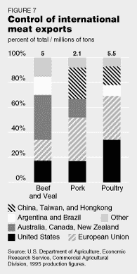 Figure 7 shows that for 1994, the cartel's basic food export regions commanded 85% of the world's export of beef and veal of 4.95 million metric tons; when the Chinese market is added in, these regions commanded 92% of the world's export trade of 2.1 million tons of pork, and 93% of the world's export trade of 5.84 million metric tons of poultry. The export of pork and poultry in China and Taiwan is increasingly run by the food cartel.