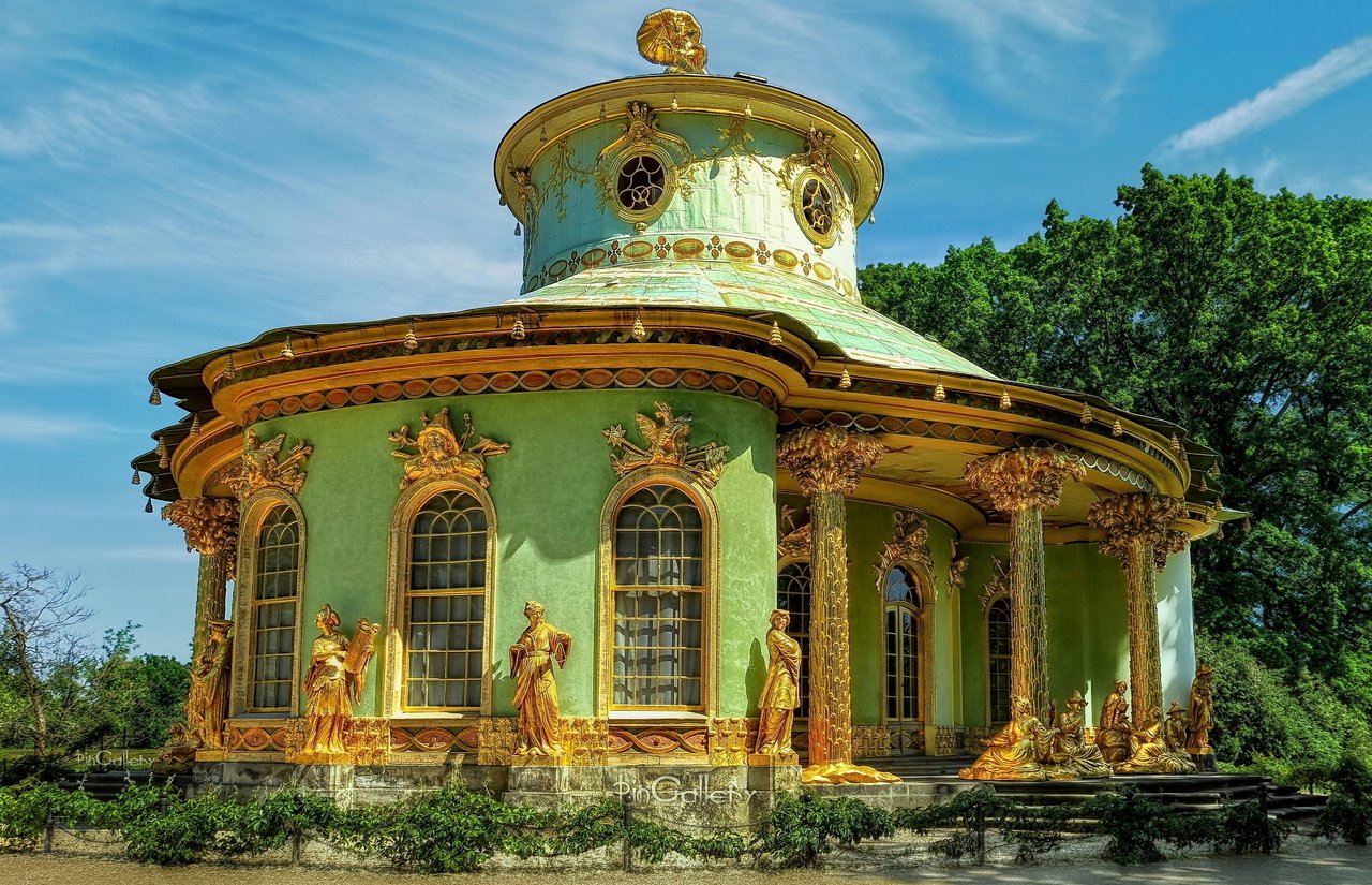The Glitter Pavilion in Potsdam. To pergolas on the eastern patio in the castle Sanssouci which the side wings cover to the garden side find her end in an empty grid pavilion. The grid pavilion is decorated with gilt solar symbols and instruments which are effective above all with sunshine well.