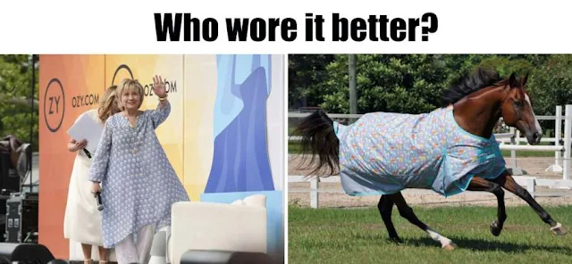 OK, about the dress. I have bought clothes in India before; I am guessing, an educated guess, mind you, that she had this made in India. It is probably the most comfortable thing in the world. No one makes light airy cotton like they do; however this print is not particularly inspiring considering the things they are capable of doing; dull; and certainly not meant to be paired over baggy pants, with sneakers, and worn to a public forum. This is dowdy house-wear, Hillary. They really should keep this woman under better watch ~ preferably lock and key!
