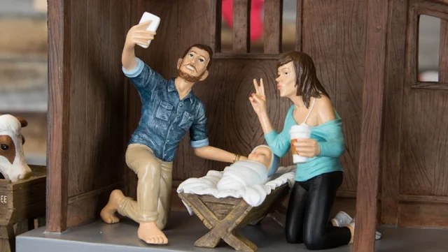 Not sure why, but this "Millennial Nativity Scene" really makes me smile. Because the couple in the creche loosely resemble my recently wed daughter and husband perhaps? This is SO their lifestyle. (Except she would never be caught dead in a one-shoulder top! Or, even worse, making a duck face.Below.)